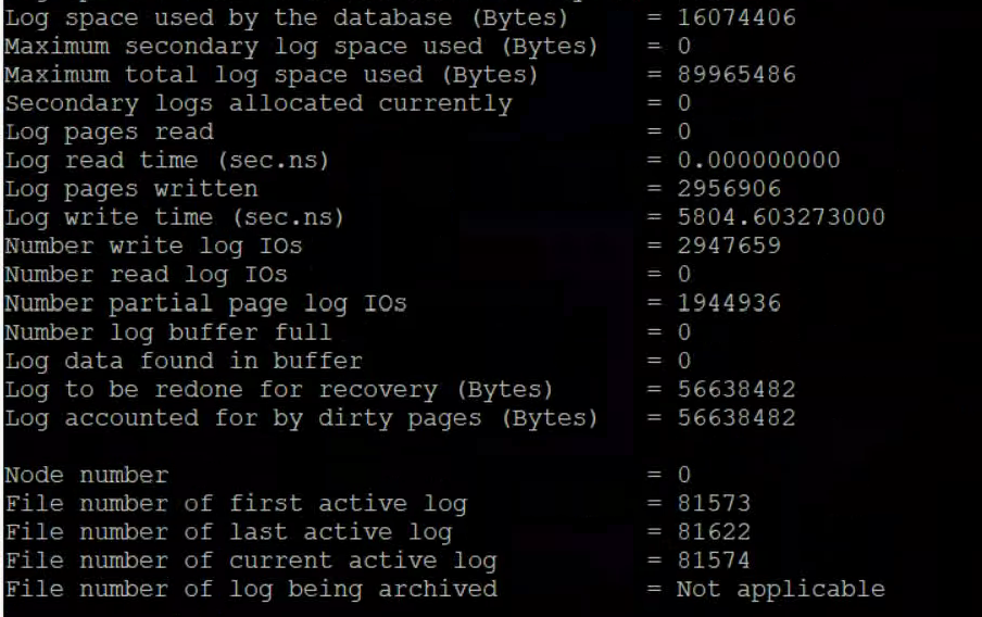 “db2pd -d ISIMDB -logs” 或 db2 “get snapshot for db on ISIMDB”