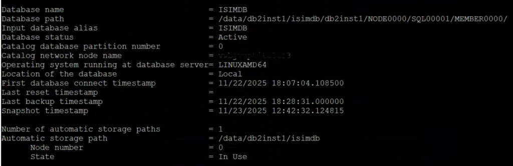 db2 “restore db ISIMDB from /restore/backups/ISIMDB taken at into ISIMDB replace existing”