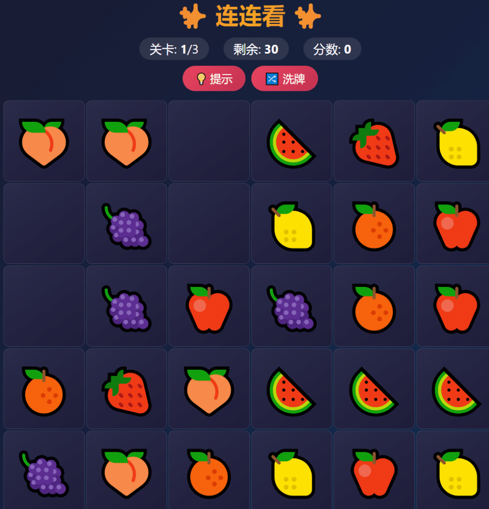 提示词:编写一个Web浏览器可以玩的游戏,连连看,三关,第1关长宽各5,第2关长宽各10,第3关长宽各15个格子,图案为水果、数字或者卡通的不重复图案,要求:两张牌中间无遮挡,消除时有特效,如果没有可以消除的则自动洗牌,全部消除完成通关。